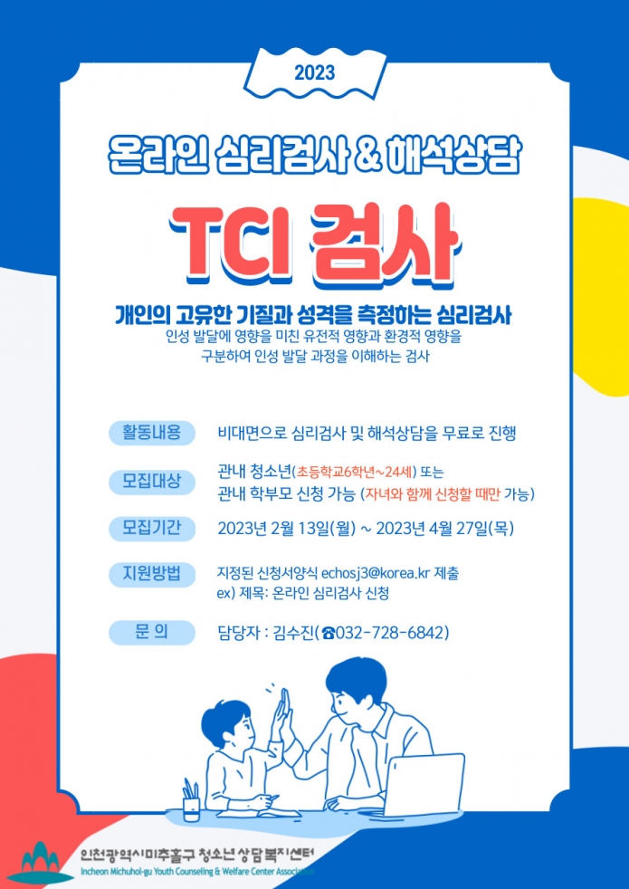 2023년 언택트 '무료 심리검사&해석상담(TCI검사:기질-성격)' 모집안내