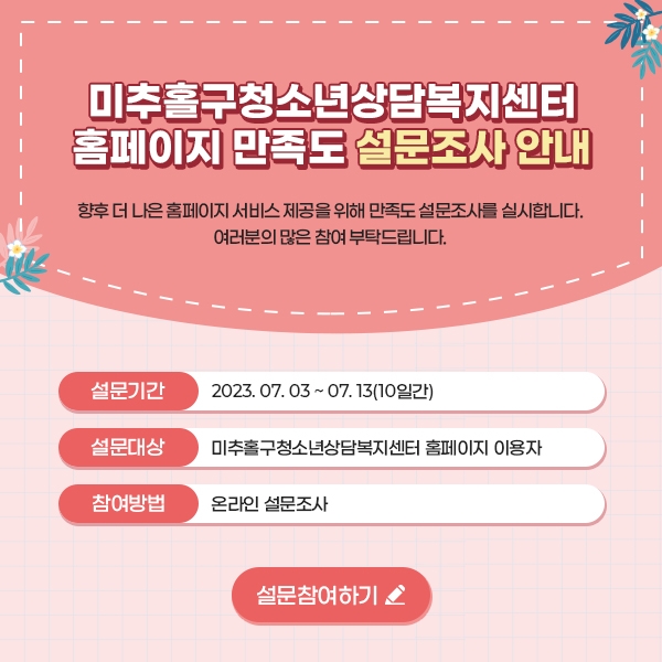 미추홀구청소년상담복지센터 홈페이지 만족도 설문조사 안내