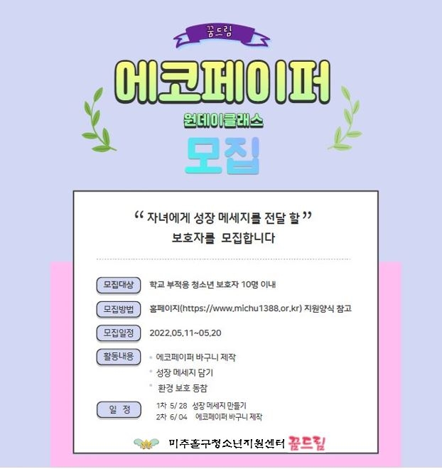 미추홀구청소년지원센터 "2022 에코페이퍼 원데이 클래스 <보호자>" 모집 안내